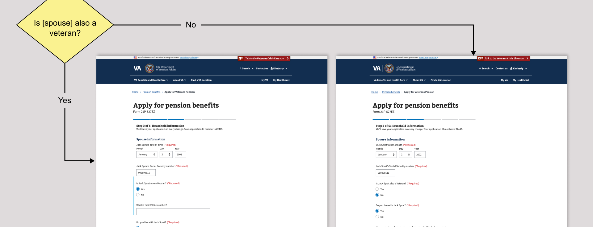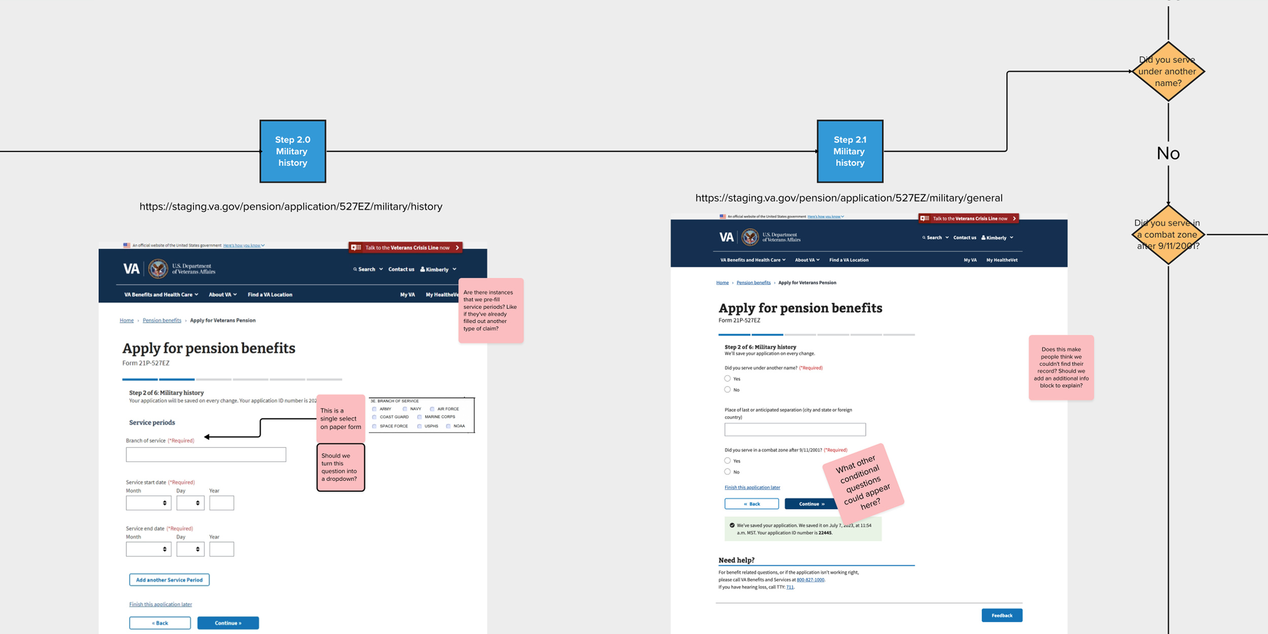 During initial discovery I interviewed stakeholders about the Pension program and found that there were critical questions missing from the digital experience that were only being asked on the paper forms. At that moment we realized the digital experience had a 100% failure rate and the form needed to be temporarily disabled. I then mapped every paper form to the digital experience to find where the discrepancies were so that we could quickly correct and reactivate the form allowing for Veterans to successfully apply for Pension benefits online again.