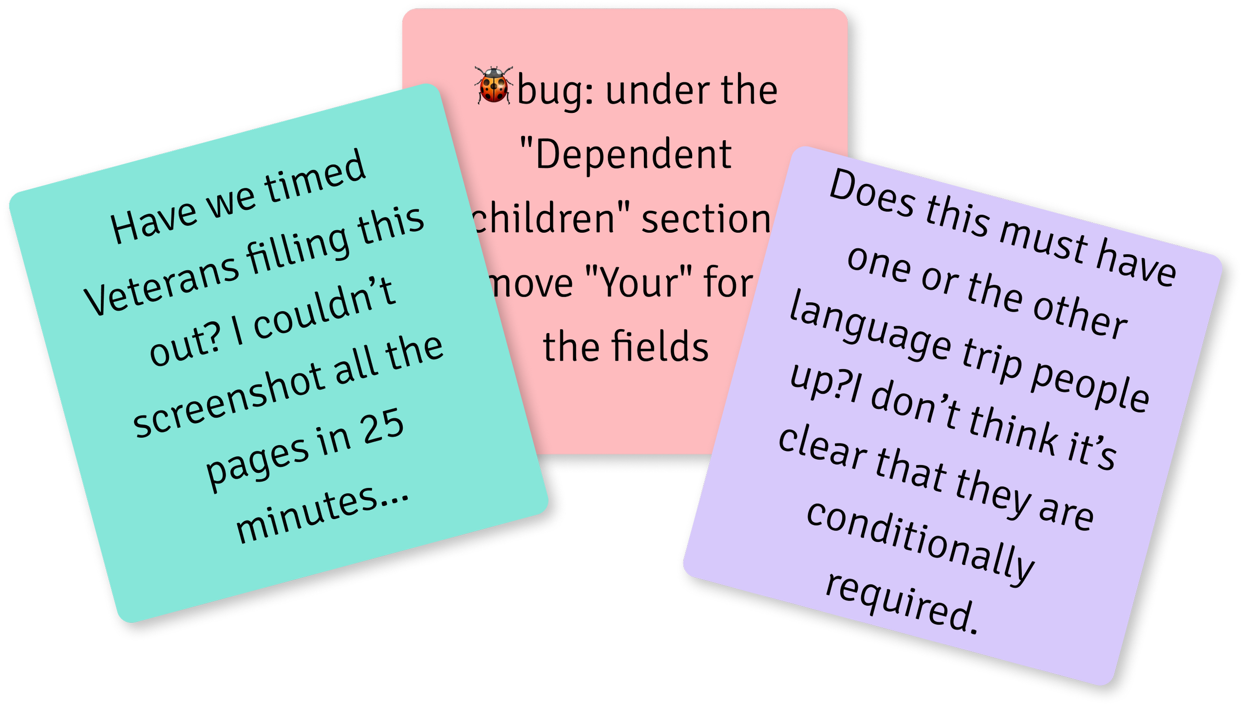 While reviewing each page not only to understand the overall user flow it was important to review each interaction. During this phase we identified bugs or interactions we expected to happen differently, opportunities to give our Veterans a better experience and discussion points to decide if we needed to make a change or needed more research to inform what our approach should be.